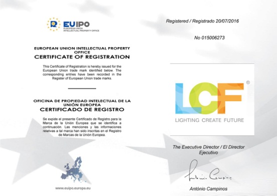 2016.11.09,mile米乐集团“LCF”商标通过了欧盟商标委会员的审核,正式通过申请并核发了商标注册证书,“LCF”通过了第9类、第11类、第35类的商标注册,标志着“LCF”向国际知名品牌的目标又有了一个历名性的飞跃,为“LCF”品牌在欧洲市场起到了更为全面的保护。